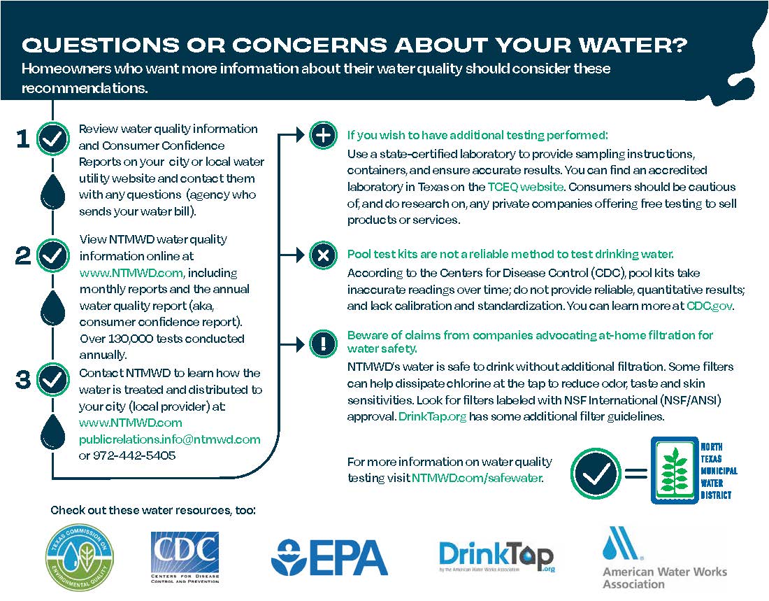 NTMWD has conducted the temporary change in water disinfectant for over a decade, and continues to meet safe drinking water standards earning recognition from the Texas Commission on Environmental Quality (TCEQ) as a Superior Public Water System.